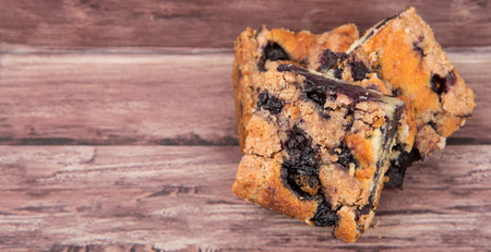 Portions of delicious homemade blueberry sponge cakes over wooden background