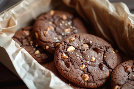 Close-up of freshly baked chocolate cookies with chocolate chips and nuts on parchment paper