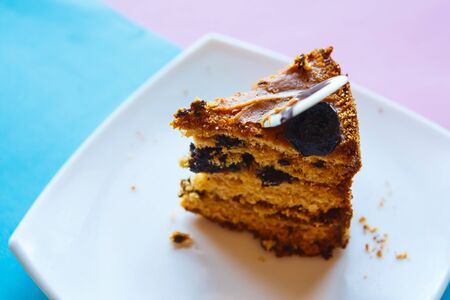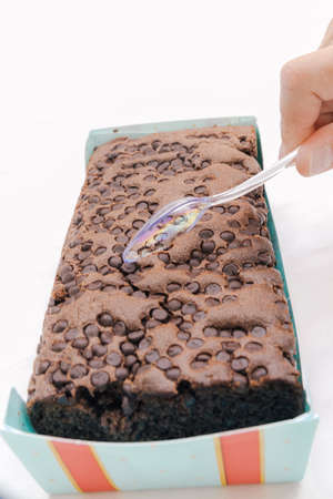 delicious chocolate chip brounie with a plastic spoon trying to steal a piece of birthday cake