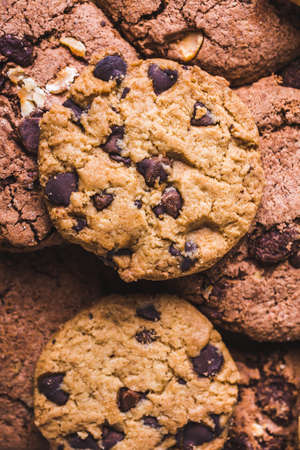 Chocolate chip cookies with hazelnuts as background. Texture of chocolate brownie cookies close up.