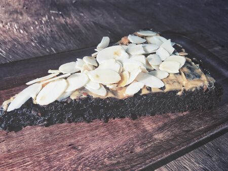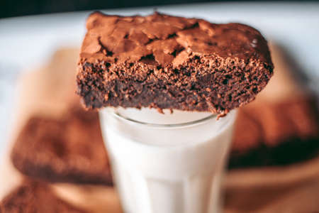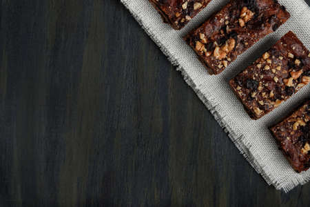 pieces of chocolate brownie on white scarf in the upper right corner in the foreground, healthy food during quarantine at home