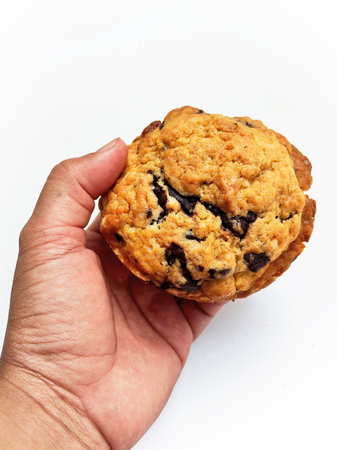 Hand is holding sweet chocolate chip cookie. Isolated on white background.