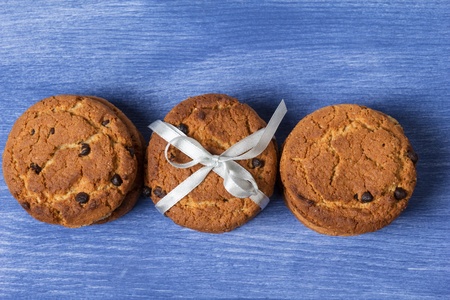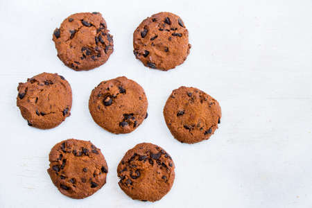 American cookies with chocolate chips on white wooden background. Top view.