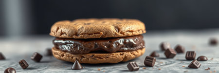 Delicious chocolate cookie sandwich filled with rich chocolate cream surrounded by chocolate chips