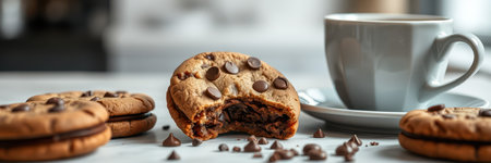 Freshly baked chocolate chip cookies and a cup of coffee on a marble countertop during a cozy afternoon