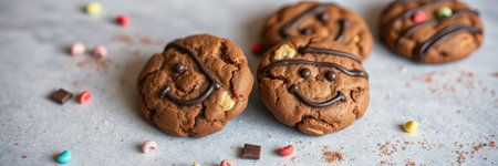 Homemade chocolate cookies with smiley faces and colorful sprinkles on a marble countertop