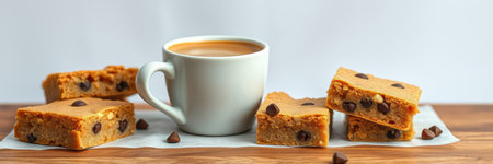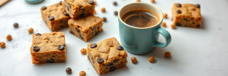 A cup of coffee with chocolate chip cookie bars on a white countertop