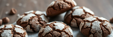 Delicious chocolate crinkle cookies arranged on a wooden table, showcasing their cracked surface and powdered sugar coating
