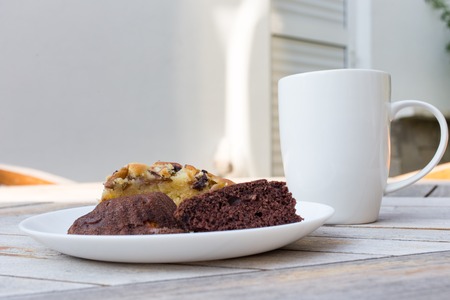Delicious breakfast cakes and coffee cup. Located on wooden table as a background.