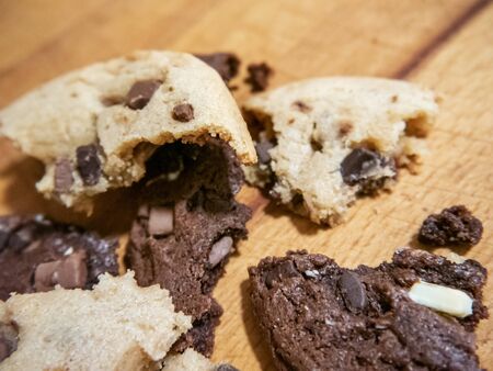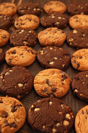 Regular and chocolate homemade cookies. They are on a wooden background