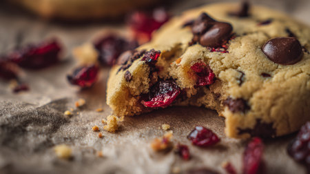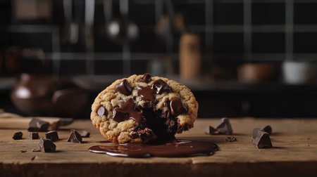 A close-up of a chocolate chip cookie with gooey chocolate chunks melting out, set against a rustic kitchen backdrop, highlighting comfort food at its best