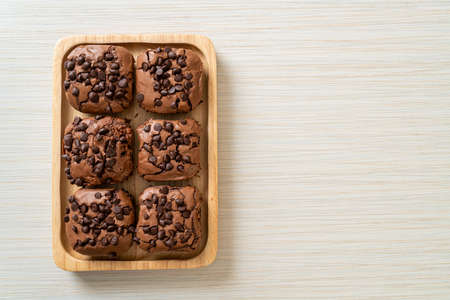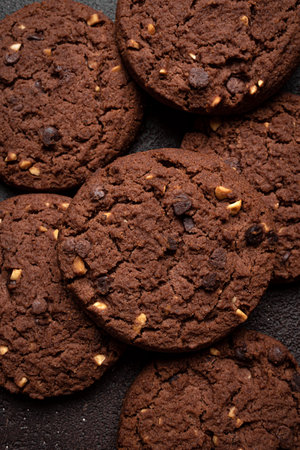 Chocolate brownie cookies. Baked Creamy Dark chocolate chip cookies on dark texture background. Morning table. Copy space.