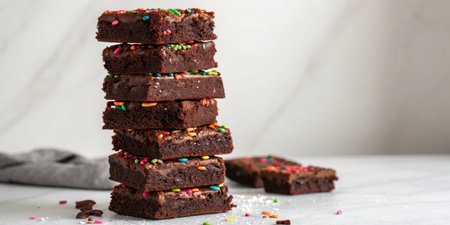Stack of chocolate brownies with colorful sprinkles on a light background