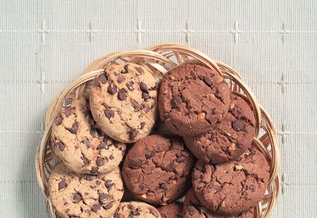 Cookies with chocolate and nuts in wicker plate on tablecloth, top view