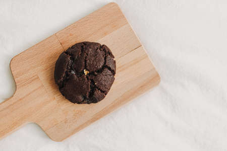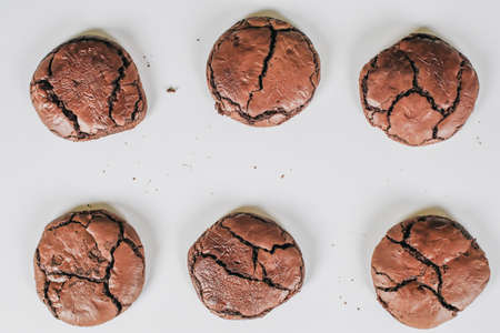 Chocolate brownie cookies. Baked Creamy Dark chocolate chip cookies on white texture background. Morning table. Copy space.
