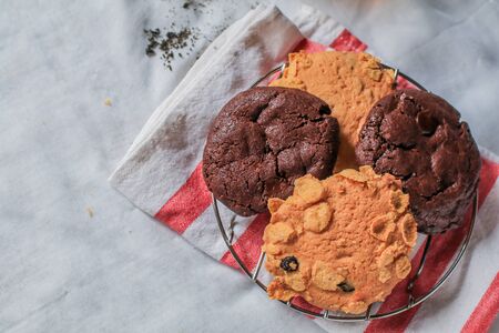 Oatmeal cookie milk cookie and chocolate chip nut cookie on grate metal red and white napkin black background.Breakfast and afternoon tea concept.