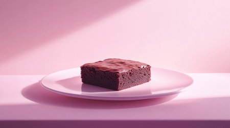 A beautifully styled rich chocolate brownie on a white plate, illuminated by soft pink lighting, ideal for food enthusiasts and culinary photographers looking for aesthetic inspiration.