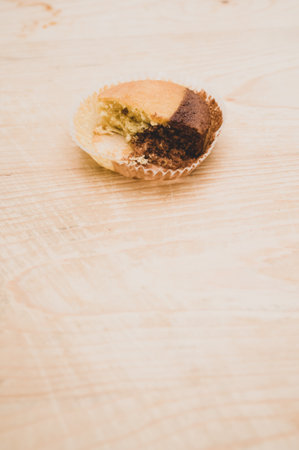 nibbled organic chocolate cupcake on a rough wooden background with text space
