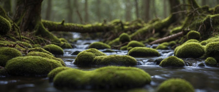 A small stream of water running through a forest with green moss, AI