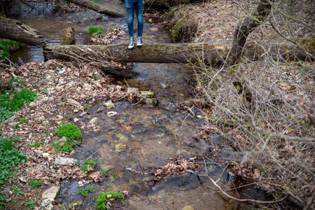 A person in athletic shoes stands on a fallen tree footbridge over a woodland stream in an early spring landscape. Bright new green growth on creek banks and clean flowing water. Natural light, with copy space.