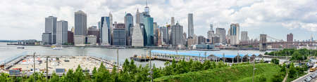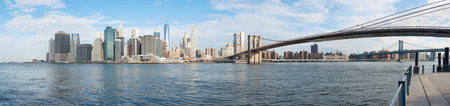 New York city skyline panorama and Brooklyn Bridge in a sunny day