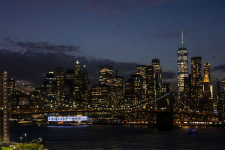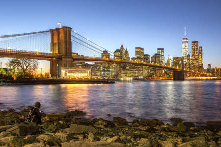 Panorama of the iconic Brooklyn Bridge and the skyline of lower Manhattan in New York after sunset