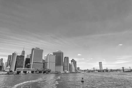 New York City skyline with skyscrapers at sunset. Downtown Manhattan known as Financial district surrounded by river