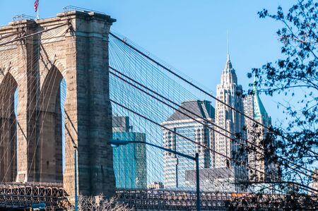 New York, USA - August 12, 2016: Brooklyn Bridge in New York. Sights, buildings and streets of New York.