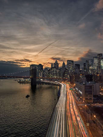 Blur background of New York City Skyline aerial view from Manhattan Bridge with skyscrapers background at dusk. Financial District of NYC with traffic light trails on FDR Drive