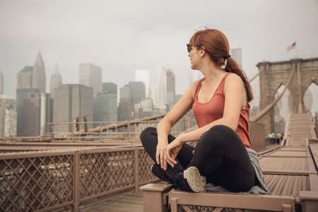New York City, NY, USA 2.09.2020 - Pretty long hair brunette girl posing on Brooklyn Bridge in front of tourist group and car traffic. Brooklyn Bridge in NY is one of most visited places in U.S.