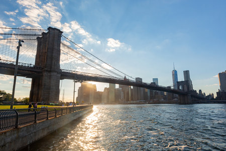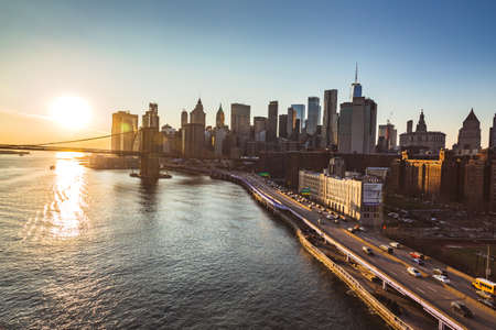 Sunset of the Brooklyn Bridge and New York City skyline at New York
