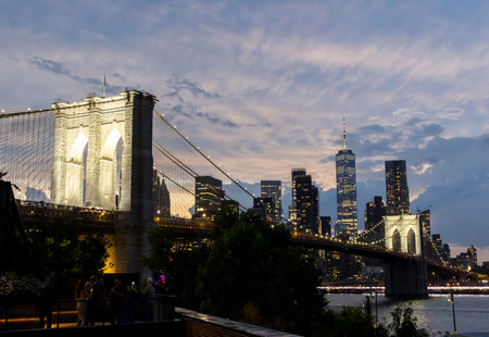 View of Brooklyn Bridge and Manhattan skyline WTC Freedom Tower from Dumbo, Brooklyn. Brooklyn Bridge is one of the oldest suspension bridges in the USA