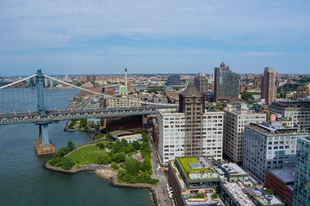 Manhattan Bridge with Brooklyn New York City skyscrapers city over Hudson River NYC US