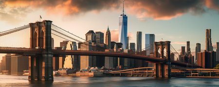 Panorama of beautiful sence of New York city with Brooklyn bridge and lower Manhattan in dusk evening Downtown of lower Manhattan of New York city and Smooth Hudson river at night. Generated with AI
