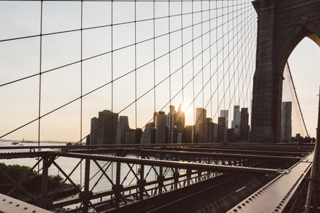 Brooklyn Bridge to Manhattan downtown, cables and blue sky. New York City skyline, financial district cityscape. World Trade Center, USA travel destination. Architecture of United States of America.