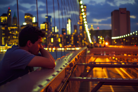 The iconic New York City skyline emerges from the deepening twilight, a testament to urban grandeur. Skyscrapers pierce the dusky sky, their lights beginning to twinkle, creating a glow. Bridges span the dark waters of the river, with faint traces of car headlights suggesting the city's ceaseless energy. The scene is characterized by cool tones and dramatic shadows, conveying a powerful and dynamic urban atmosphere.