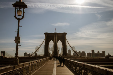 People crossing the Brooklyn Bridge in the pedestrian zone. Cityscape on a cold autumn morning. In the background the buildings of Brooklyn on the banks of the East River. New York