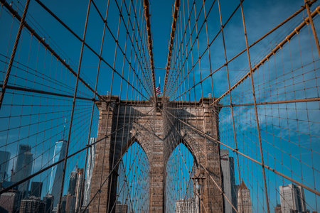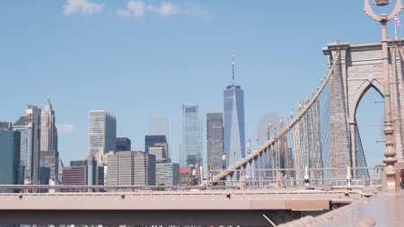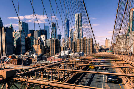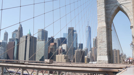 Brooklyn Bridge to Manhattan downtown, cables and blue sky. New York City skyline, financial district cityscape. World Trade Center, USA travel destination. Architecture of United States of America.