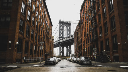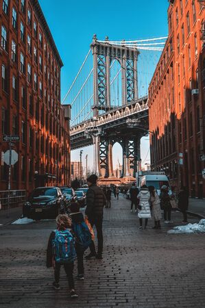 BROOKLYN, UNITED STATES - Apr 01, 2018: Brooklyn's iconic street in Dumbo - Manhattan Bridge