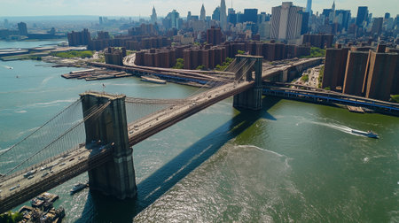 Aerial view of the Brooklyn Bridge over the East River in New York City