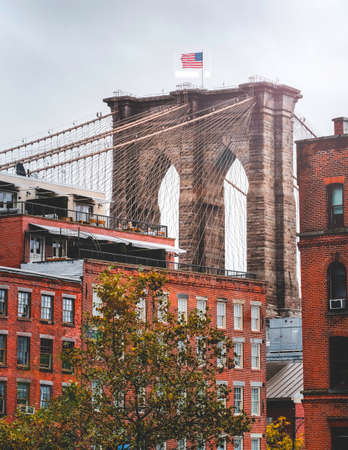 Details of the architecture of the famous Brooklyn Bridge with the American flag, New York