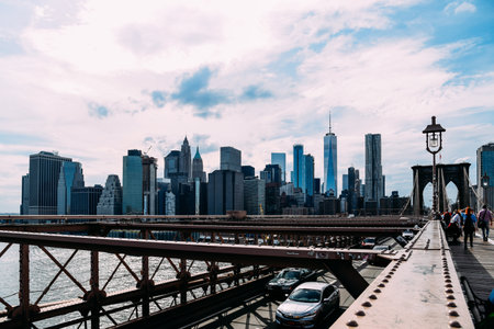 Brooklyn Bridge to Manhattan downtown. New York City skyline architecture, financial district cityscape. World Trade Center, WTC skyscraper, lantern. USA travel destination. United States of America.