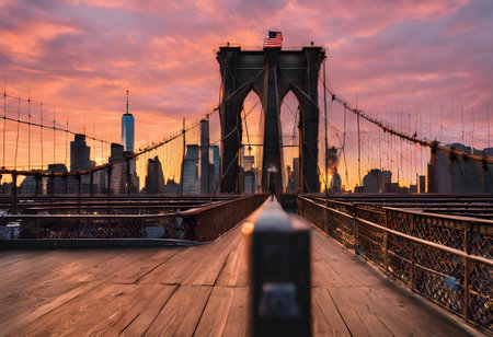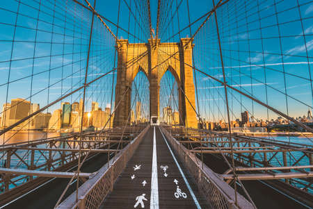 Magical sunset view of the Brooklyn Bridge. Empty bridge during lockdown