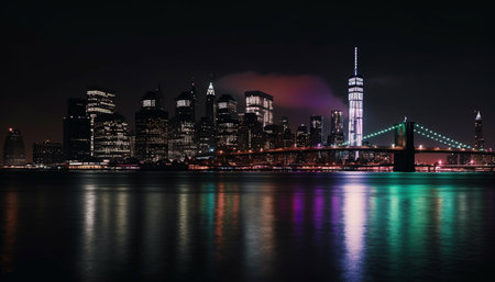 Illuminated cityscape reflects on water, showcasing urban skyline architecture generated by artificial intelligence