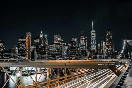 Blur background of New York City Skyline aerial view from Manhattan Bridge with skyscrapers background at dusk. Financial District of NYC with traffic light trails on FDR Drive