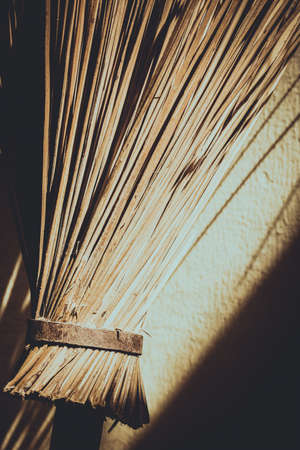 Broom for cleaning. Restoring order. Cleaning services. An old-fashioned garden tool for sweeping paths near a house. Made from natural materials.