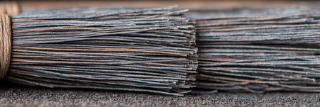 This image features a close-up of a traditional broom made from natural straws, highlighting its bristles and ergonomic design for cleaning tasks.