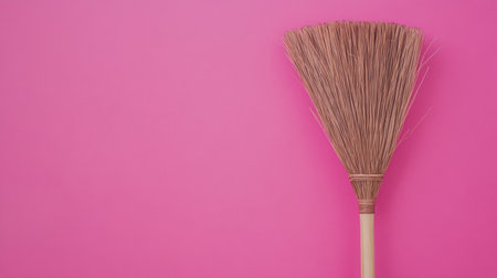 This image showcases a close-up of a traditional broom set against a bright pink background, emphasizing simplicity and aesthetics in home cleaning and decor.