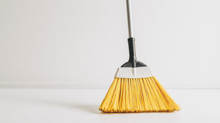 A vibrant yellow broom stands upright on a clean surface, symbolizing effective household cleaning and minimalistic design, ideal for home organization.