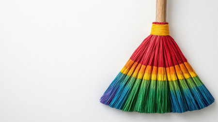 This image features a vibrant broom with rainbow-colored bristles and a wooden handle, perfect for showcasing creativity in cleaning or home decor.